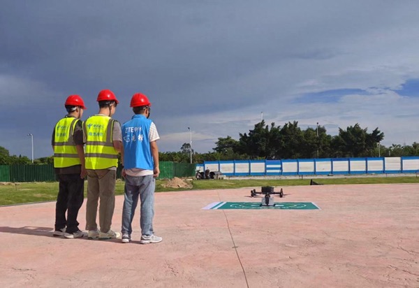中国电信北海分公司和中兴公司的技术专家们正在调试无人机,控制无人机安全降落