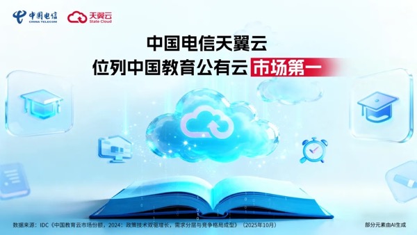 近日,国际数据公司IDC发布的《中国教育云市场份额,2024:政策技术双驱增长,需求分层与竞争格局成型》(Doc# CHC53785125,2025年10月)报告显示,中国电信天翼云以16.38%的市场份额位居中国教育公有云市场第一,凭借领先的产品、解决方案以及高效的服务,展现了在教育云领域的强劲科技实力与市场领导力。