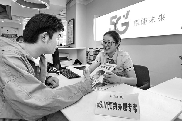 近日,备受关注的中国电信eSIM手机业务正式上线,为广大客户带来无需实体卡便可畅享高速移动网络的新体验。中国电信江苏镇江分公司做实做优线上线下预约、实体店办理eSIM业务的相关服务,工作人员耐心细致地为客户讲解eSIM优势、开通流程以及适配的终端设备,确保客户能够清晰、全面地了解这项创新业务。图为一位客户在镇江分公司新马路营业厅现场咨询eSIM业务。